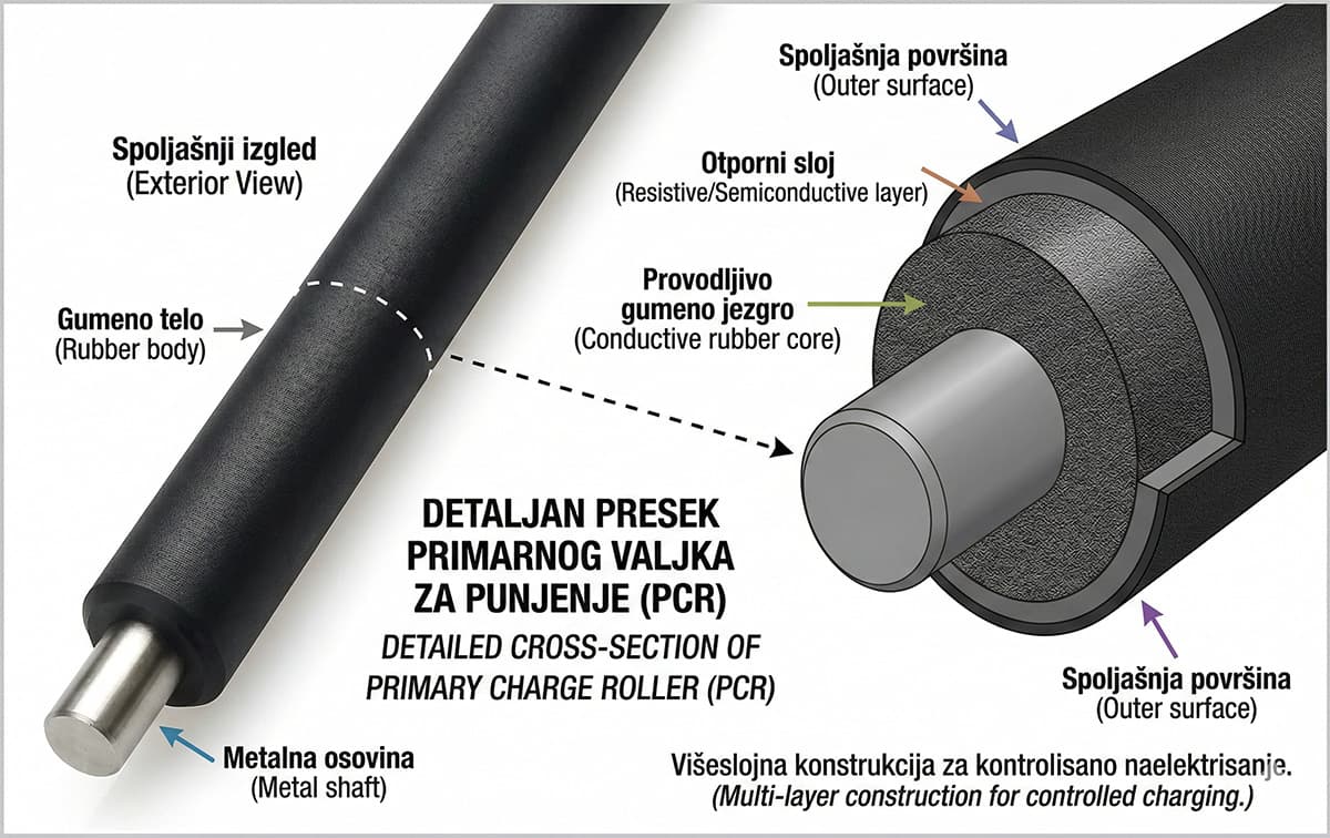 Ovo je najčešći i, srećom, najlakše rešiv uzrok. Unutar svake toner kasete nalazi se PCR valjak (Primary Charge Roller) — mali crni gumeni valjak čija je jedina uloga da nanosi ravnomeran negativni naboj na OPC bubanj pre svakog štampanja.