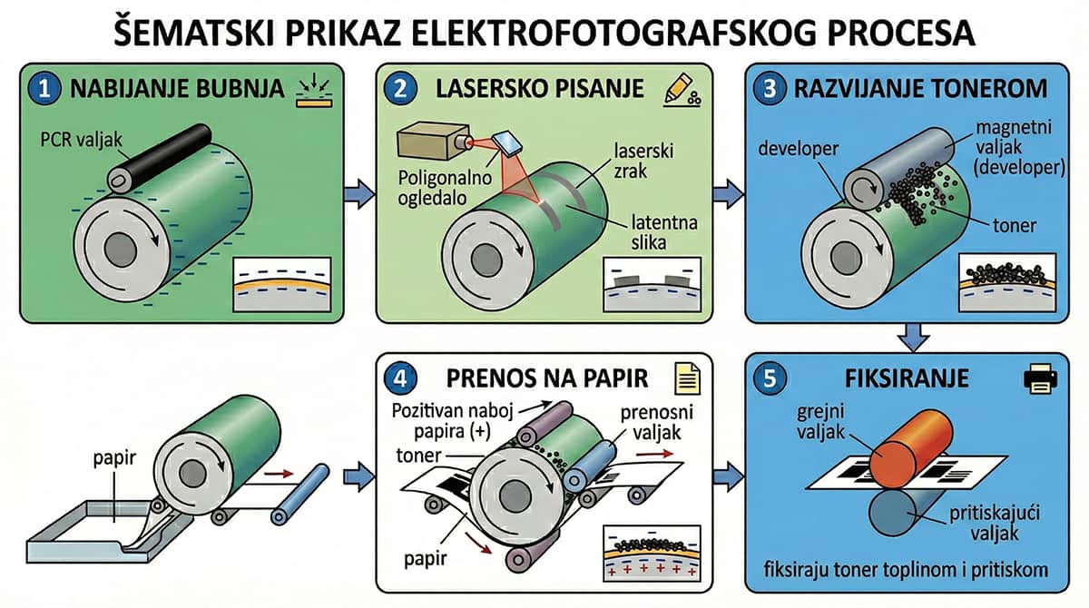 Proces izgleda ovako: pre svakog štampanja, specijalni valjak koji se naziva OPC bubanj (fotosenzitivni bubanj) se ravnomerno naelektriše negativnim naponom. Zatim, laserski zrak "upisuje" sliku na taj bubanj — tačno na mestima gde treba da bude toner, laserski zrak smanjuje negativni naboj. Ta mesta postaju privlačna za čestice toner praha. Toner prah se lepi tamo gde nema naboja, a odbija se od mesta koja su još uvek negativno naelektrisana. Na kraju, taj uzorak se prenosi na papir i fiksira toplinom.