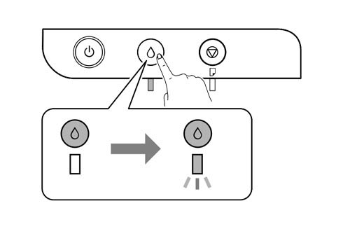 U poslednjem koraku u dopuni rezervoara mastilom kao u prvom koraku potrebno je da držite dugme 5 sekundi kao što je prikazano na slici. Kada se lampica ugasi štampač je spreman za upotrebu.