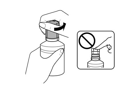 U ovom koraku držite bočicu sa mastilom uspravno a zatim odvrnite čep sa iste. Pre otvaranja nemojte mućkati mastilo. Nakon otvaranja nemojte rukom dodirivati vrh bočice.